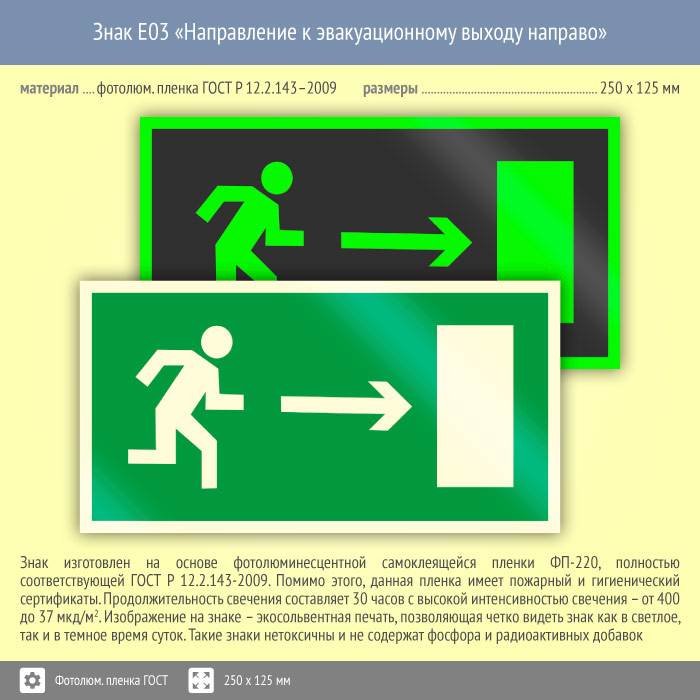 Знак E03 «Направление к эвакуационному выходу направо» (фотолюминесцентная пленка ГОСТ 34428-2018, 250х125 мм) в Химках купить