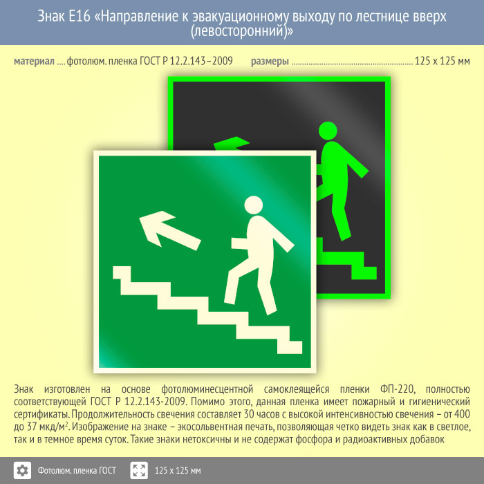Знак E16 «Направление к эвакуационному выходу по лестнице вверх (левосторонний)» (фотолюминесцентная пленка ГОСТ 34428-2018, 125х125 мм) в Химках купить