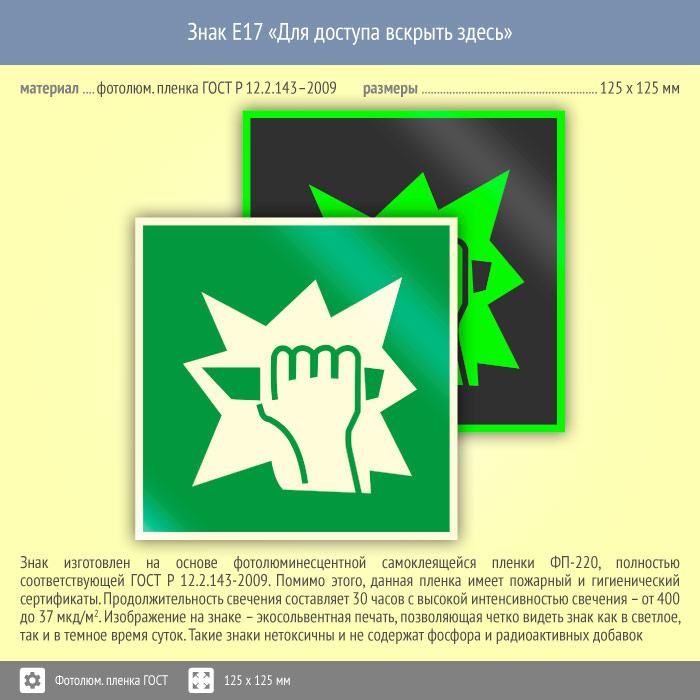 Знак E17 «Для доступа вскрыть здесь» (фотолюминесцентная пленка ГОСТ 34428-2018, 125х125 мм) в Химках купить