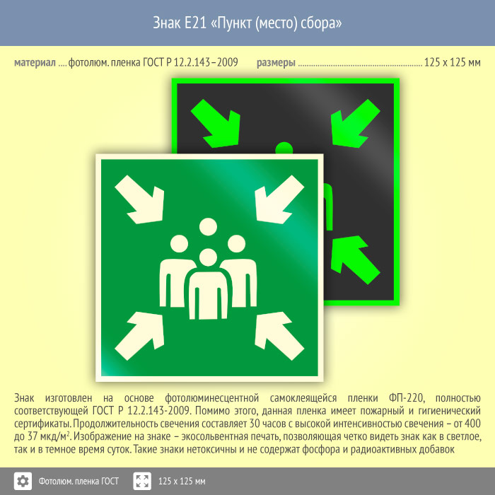 Знак E21 «Пункт (место) сбора» (фотолюминесцентная пленка ГОСТ 34428-2018, 125х125 мм) в Химках купить