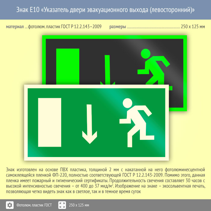 Знак E10 «Указатель двери эвакуационного выхода (левосторонний)» (фотолюминесцентный пластик ГОСТ 34428-2018, 250х125 мм) в Химках купить