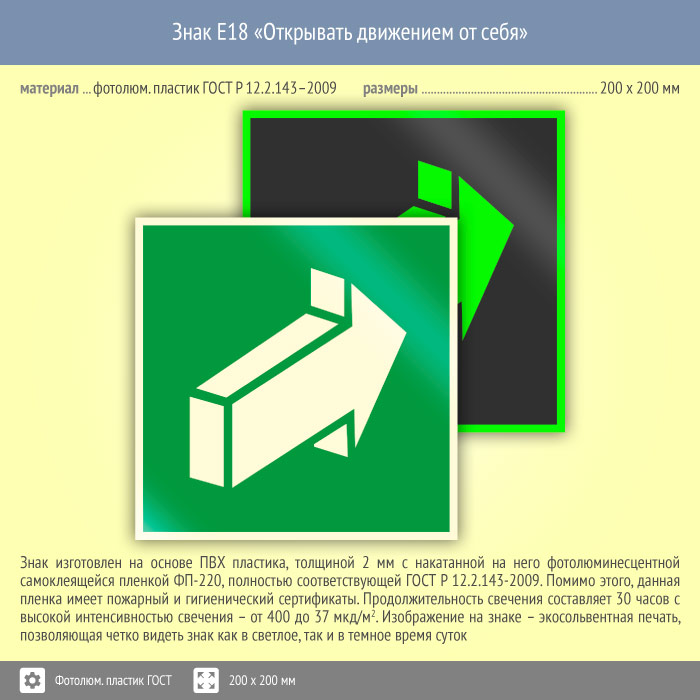 Знак E18 «Открывать движением от себя» (фотолюминесцентный пластик ГОСТ 34428-2018, 200х200 мм) в Химках купить