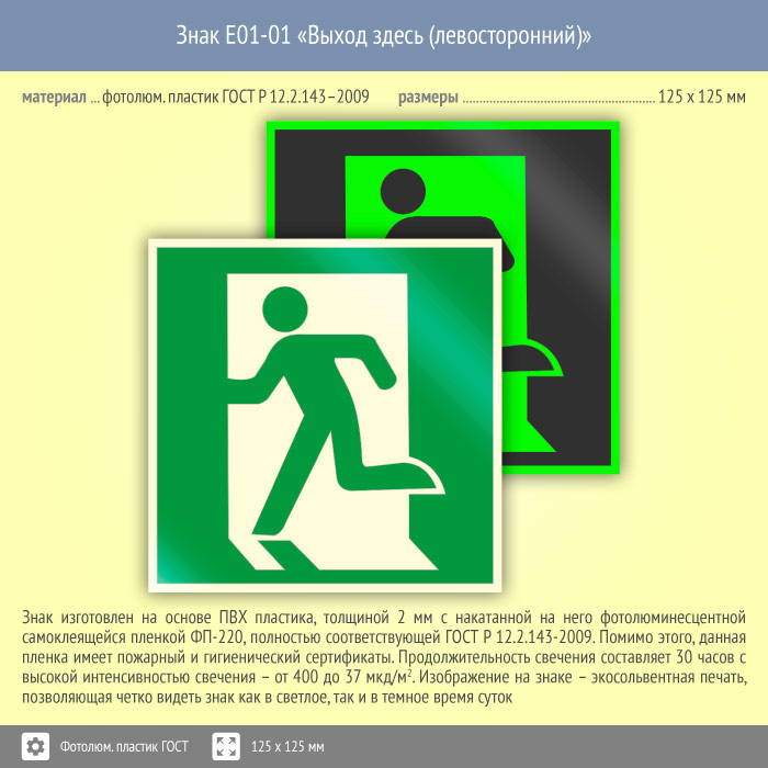 Знак E01-01 «Выход здесь (левосторонний)» (фотолюминесцентный пластик ГОСТ 34428-2018, 125х125 мм) в Химках купить