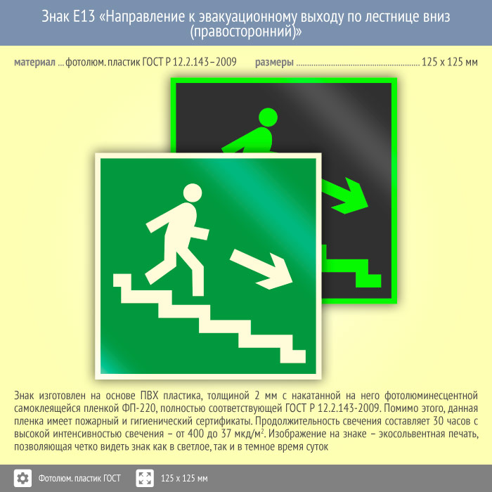Знак E13 «Направление к эвакуационному выходу по лестнице вниз (правосторонний)» (фотолюминесцентный пластик ГОСТ 34428-2018, 125х125 мм) в Химках купить