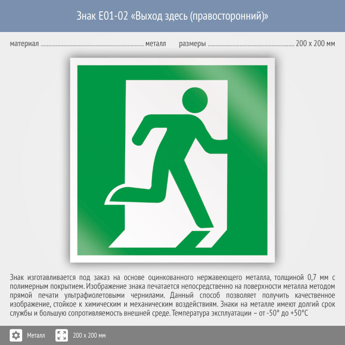 Знак E01-02 «Выход здесь (правосторонний)» (металл, 200х200 мм) в Химках купить