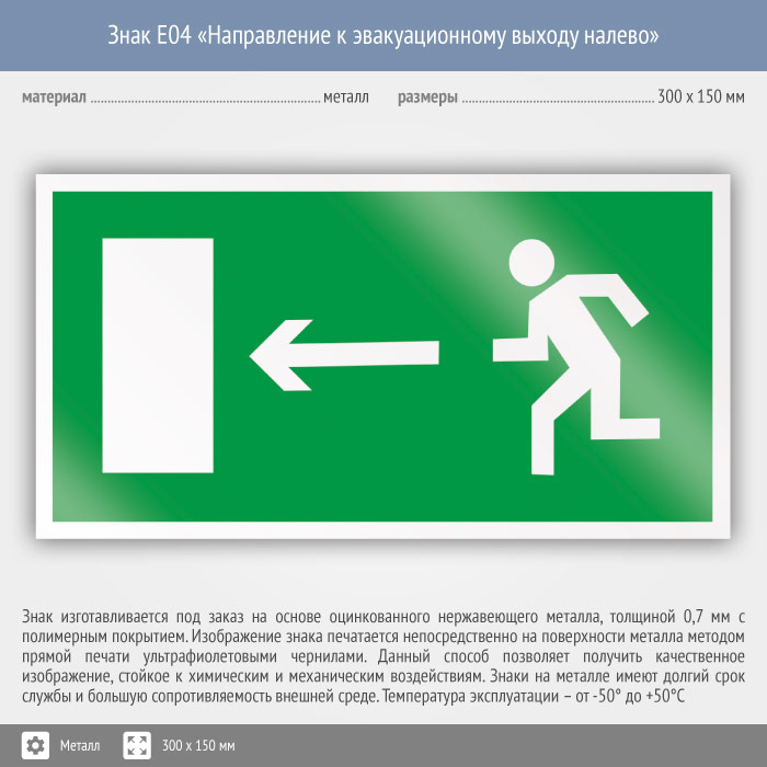 Знак E04 «Направление к эвакуационному выходу налево» (металл, 300х150 мм) в Химках купить