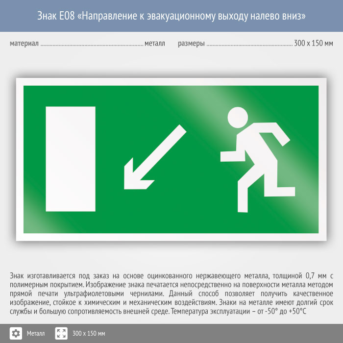 Знак E08 «Направление к эвакуационному выходу налево вниз» (металл, 300х150 мм) в Химках купить