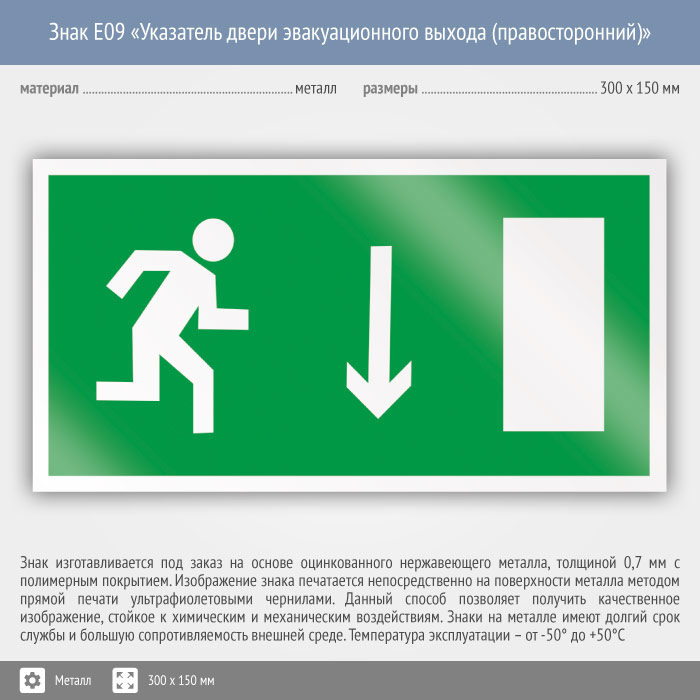 Знак E09 «Указатель двери эвакуационного выхода (правосторонний)» (металл, 300х150 мм) в Химках купить