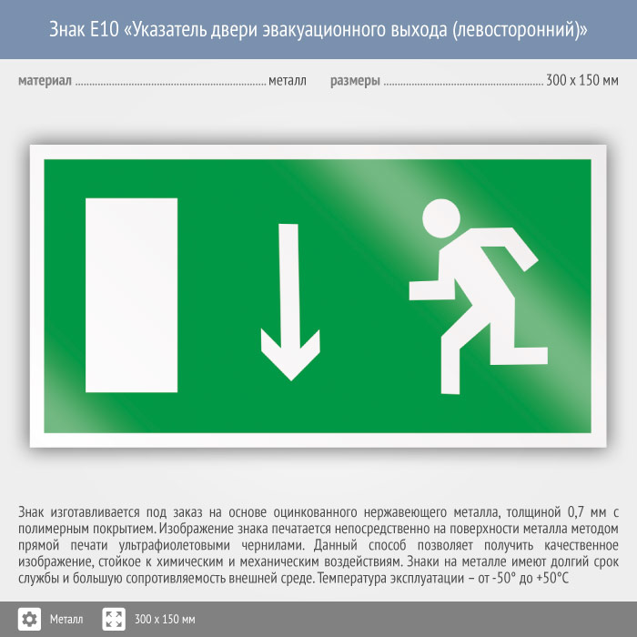Знак E10 «Указатель двери эвакуационного выхода (левосторонний)» (металл, 300х150 мм) в Химках купить
