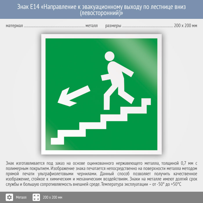 Знак E14 «Направление к эвакуационному выходу по лестнице вниз (левосторонний)» (металл, 200х200 мм) в Химках купить