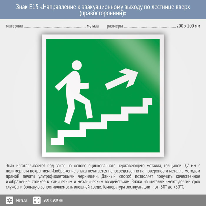 Знак E15 «Направление к эвакуационному выходу по лестнице вверх (правосторонний)» (металл, 200х200 мм) в Химках купить