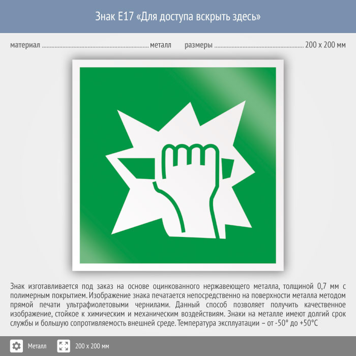 Знак E17 «Для доступа вскрыть здесь» (металл, 200х200 мм) в Химках купить