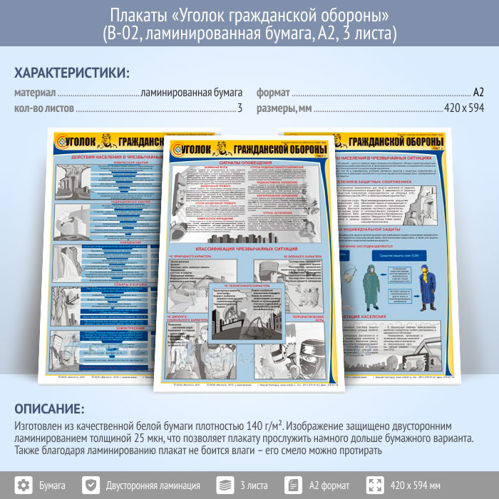 Плакаты «Уголок гражданской обороны» (В-02, ламинированная бумага, А2, 3 листа) в Химках купить