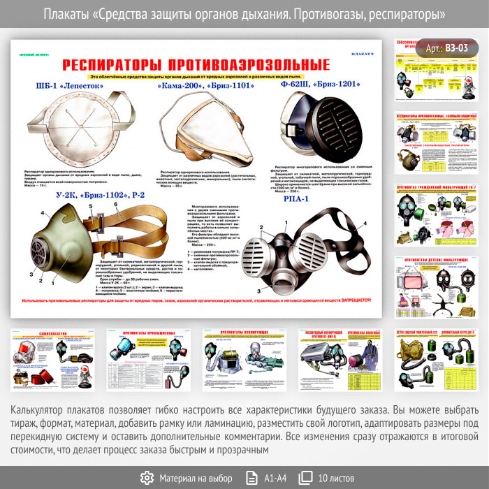 Плакаты «Средства защиты органов дыхания. Противогазы, респираторы» (ВЗ-03, 10 листов) в Химках купить