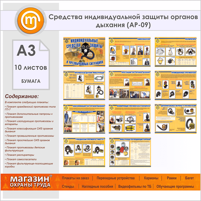 Плакаты «Средства индивидуальной защиты органов дыхания» (АР-09, бумага, А3, 10 листов) в Химках купить