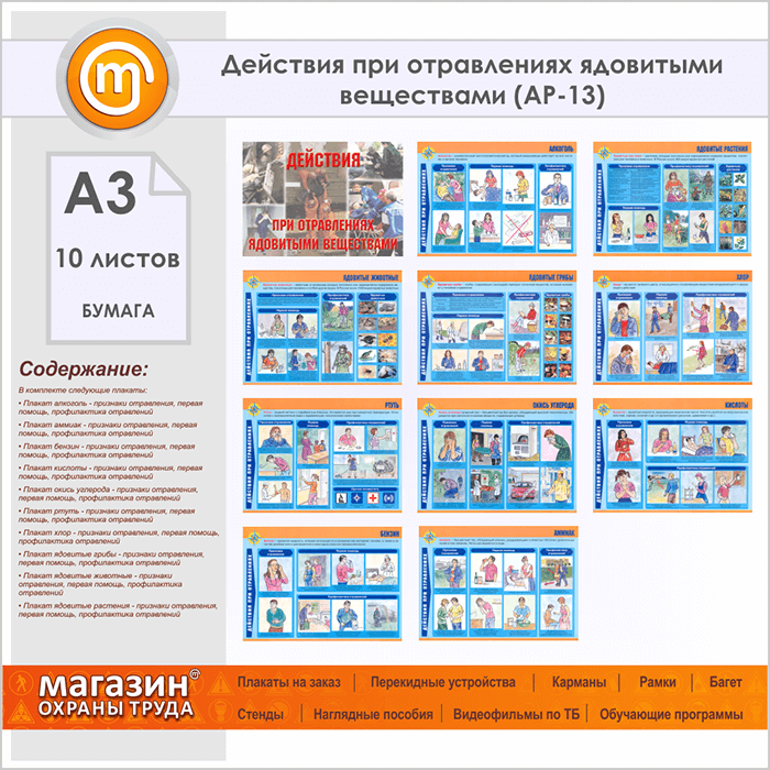 Плакаты «Действия при отравлениях ядовитыми веществами» (АР-13, бумага, А3, 10 листов) в Химках купить