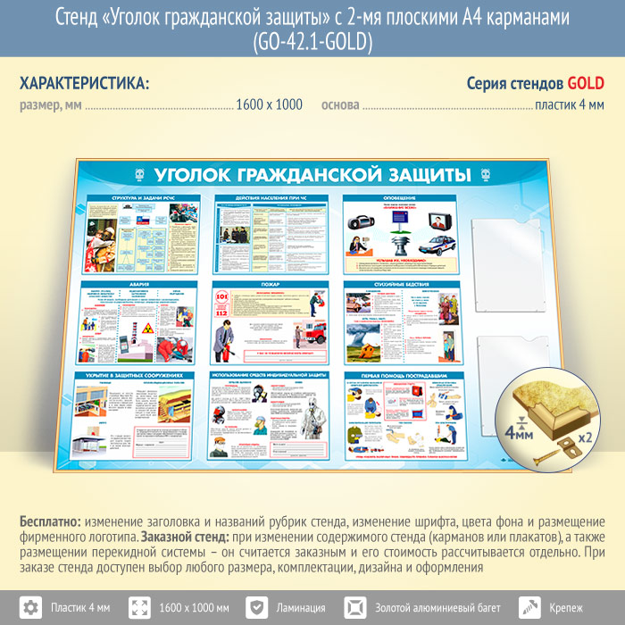 Стенд «Уголок гражданской защиты» с 2-мя плоскими А4 карманами (GO-42.1-GOLD) в Химках купить