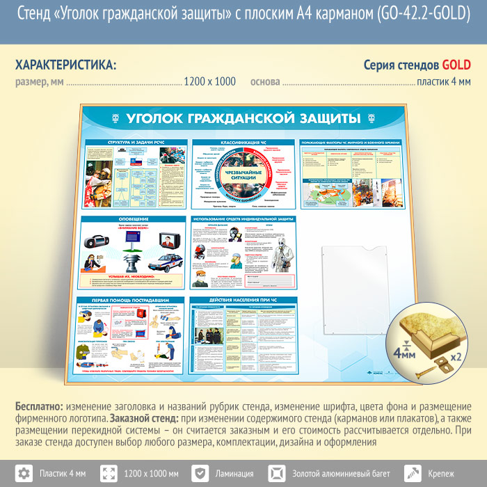 Стенд «Уголок гражданской защиты» с плоским А4 карманом (GO-42.2-GOLD) в Химках купить