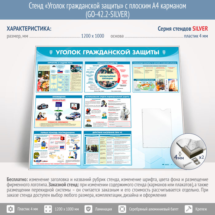Стенд «Уголок гражданской защиты» с плоским А4 карманом (GO-42.2-SILVER) в Химках купить