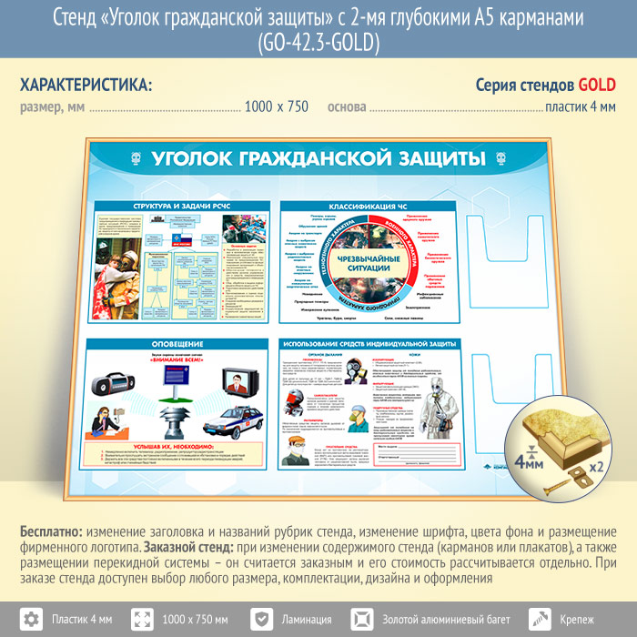 Стенд «Уголок гражданской защиты» с 2-мя глубокими А5 карманами (GO-42.3-GOLD) в Химках купить