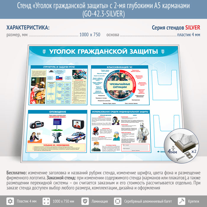 Стенд «Уголок гражданской защиты» с 2-мя глубокими А5 карманами (GO-42.3-SILVER) в Химках купить