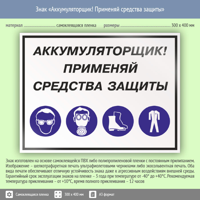 Знак «Аккумуляторщик! Применяй средства защиты», КЗ-02 (пленка, 400х300 мм) в Химках купить