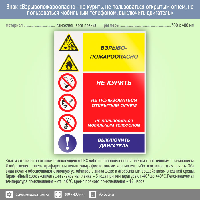 Знак «Взрывопожароопасно - не курить, не пользоваться открытым огнем, не пользоваться мобильным телефоном, выключить двигатель», КЗ-11 (пленка, 300х400 мм) в Химках купить