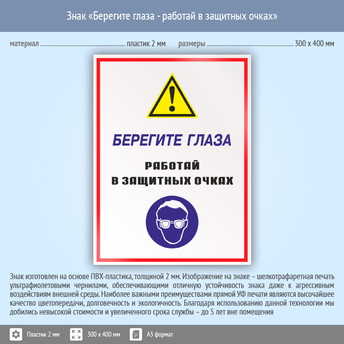 Знак «Берегите глаза - работай в защитных очках», КЗ-04 (пластик, 300х400 мм) в Химках купить