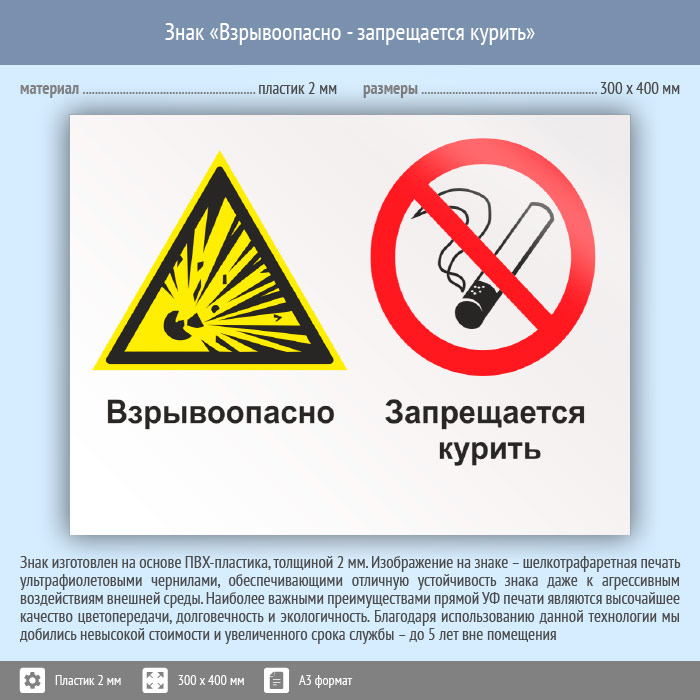 Знак «Взрывоопасно - запрещается курить», КЗ-06 (пластик, 400х300 мм) в Химках купить