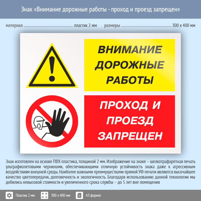 Знак «Внимание дорожные работы - проход и проезд запрещен», КЗ-14 (пластик, 400х300 мм) в Химках купить