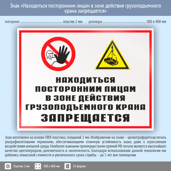 Знак «Находиться посторонним лицам в зоне действия грузоподъемного крана запрещается», КЗ-23 (пластик, 400х300 мм) в Химках купить