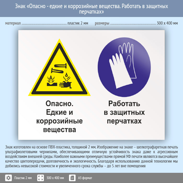 Знак «Опасно - едкие и коррозийные вещества. Работать в защитных перчатках», КЗ-36 (пластик, 400х300 мм) в Химках купить