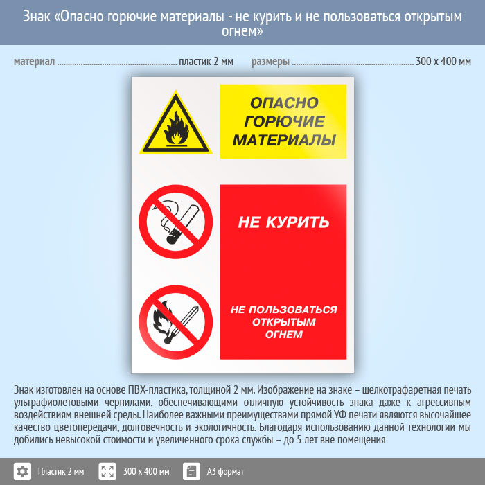 Знак «Опасно горючие материалы - не курить и не пользоваться открытым огнем», КЗ-45 (пластик, 300х400 мм) в Химках купить