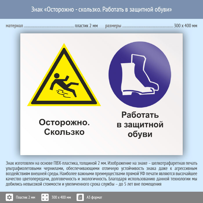 Знак «Осторожно - скользко. Работать в защитной обуви», КЗ-57 (пластик, 400х300 мм) в Химках купить