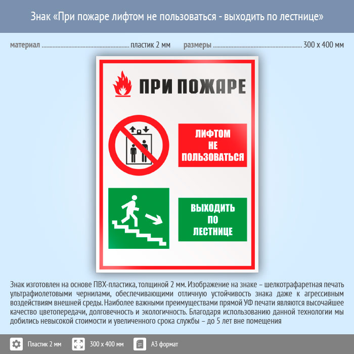 Знак «При пожаре лифтом не пользоваться - выходить по лестнице», КЗ-73 (пластик, 300х400 мм) в Химках купить