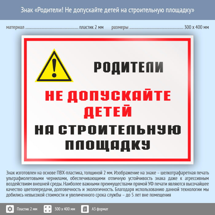 Знак «Родители! Не допускайте детей на строительную площадку», КЗ-84 (пластик, 400х300 мм) в Химках купить