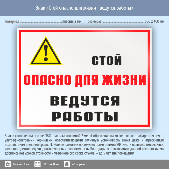 Знак «Стой опасно для жизни - ведутся работы», КЗ-86 (пластик, 400х300 мм) в Химках купить