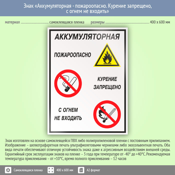Знак «Аккумуляторная - пожароопасно. Курение запрещено, с огнем не входить», КЗ-01 (пленка, 400х600 мм) в Химках купить