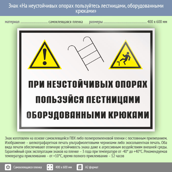 Знак «На неустойчивых опорах пользуйтесь лестницами, оборудованными крюками», КЗ-22 (пленка, 600х400 мм) в Химках купить