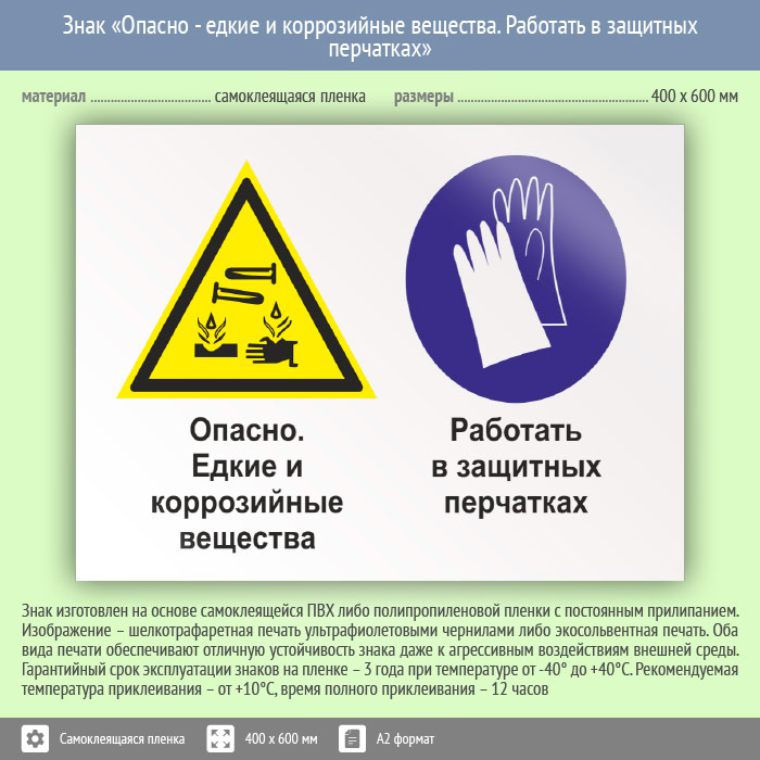 Знак «Опасно - едкие и коррозийные вещества. Работать в защитных перчатках», КЗ-36 (пленка, 600х400 мм) в Химках купить