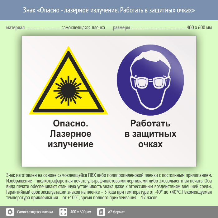 Знак «Опасно - лазерное излучение. Работать в защитных очках», КЗ-38 (пленка, 600х400 мм) в Химках купить