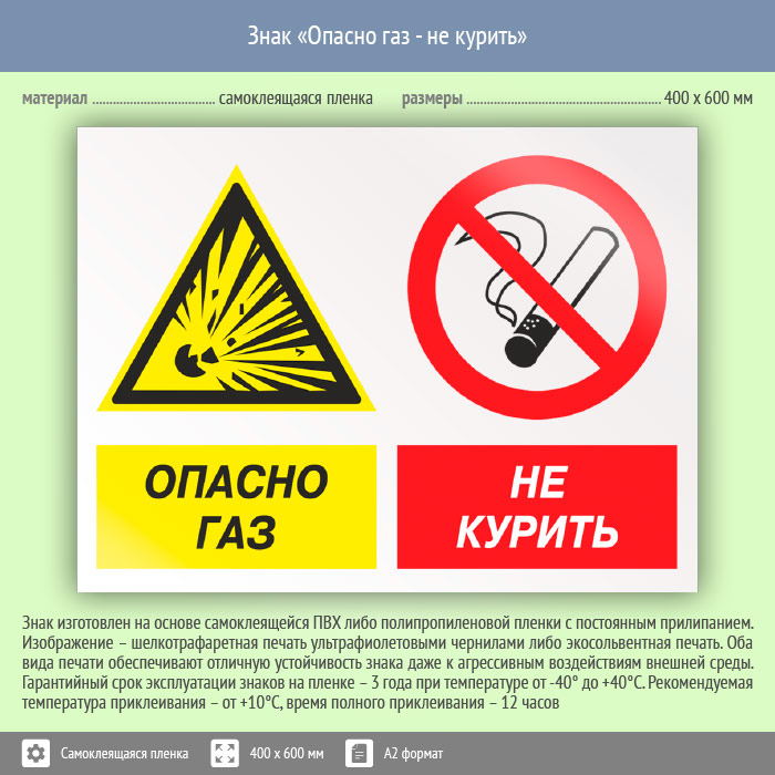 Знак «Опасно газ - не курить», КЗ-44 (пленка, 600х400 мм) в Химках купить