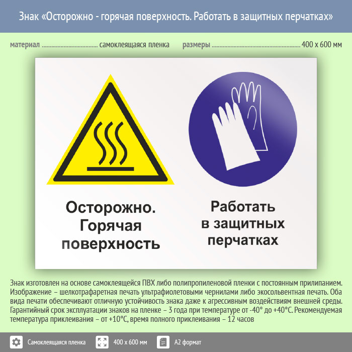 Знак «Осторожно - горячая поверхность. Работать в защитных перчатках», КЗ-55 (пленка, 600х400 мм) в Химках купить