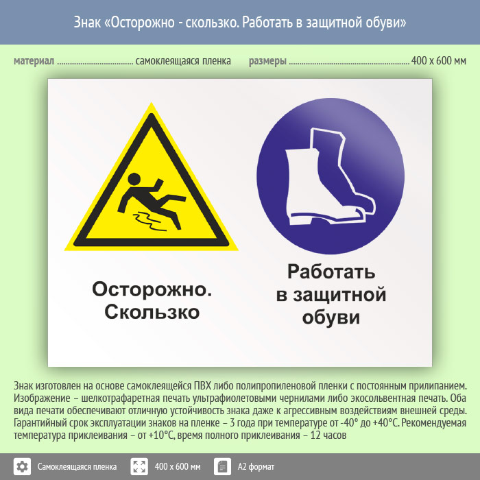Знак «Осторожно - скользко. Работать в защитной обуви», КЗ-57 (пленка, 600х400 мм) в Химках купить