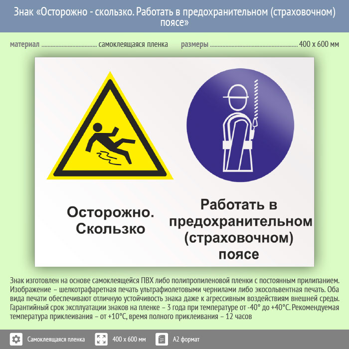 Знак «Осторожно - скользко. Работать в предохранительном (страховочном) поясе», КЗ-58 (пленка, 600х400 мм) в Химках купить