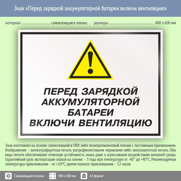 Знак «Перед зарядкой аккумуляторной батареи включи вентиляцию», КЗ-63 (пленка, 600х400 мм) в Химках купить