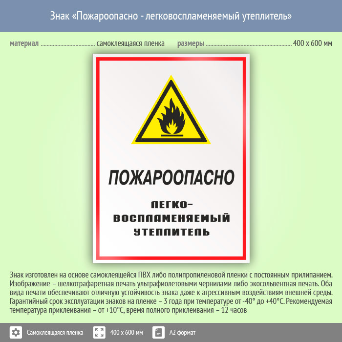 Знак «Пожароопасно - легковоспламеняемый утеплитель», КЗ-68 (пленка, 400х600 мм) в Химках купить