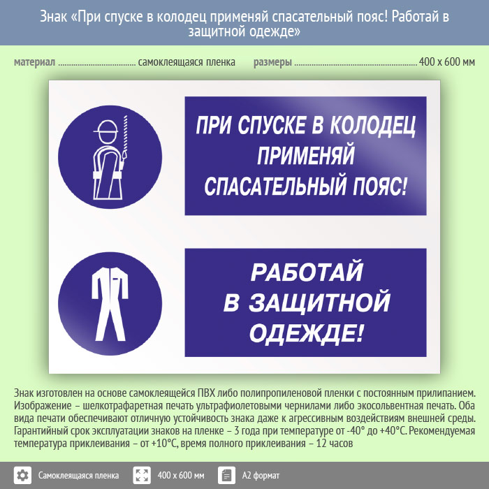 Знак «При спуске в колодец применяй спасательный пояс! Работай в защитной одежде», КЗ-76 (пленка, 600х400 мм) в Химках купить