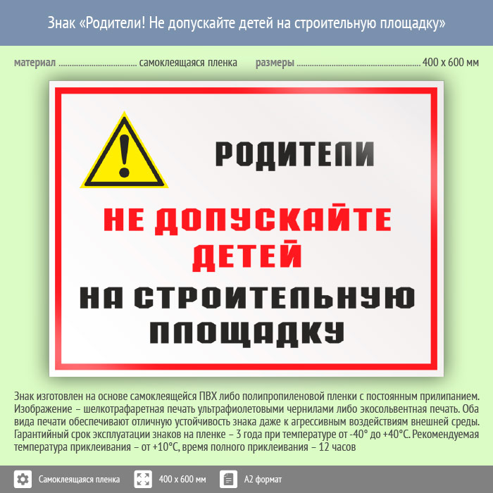 Знак «Родители! Не допускайте детей на строительную площадку», КЗ-84 (пленка, 600х400 мм) в Химках купить