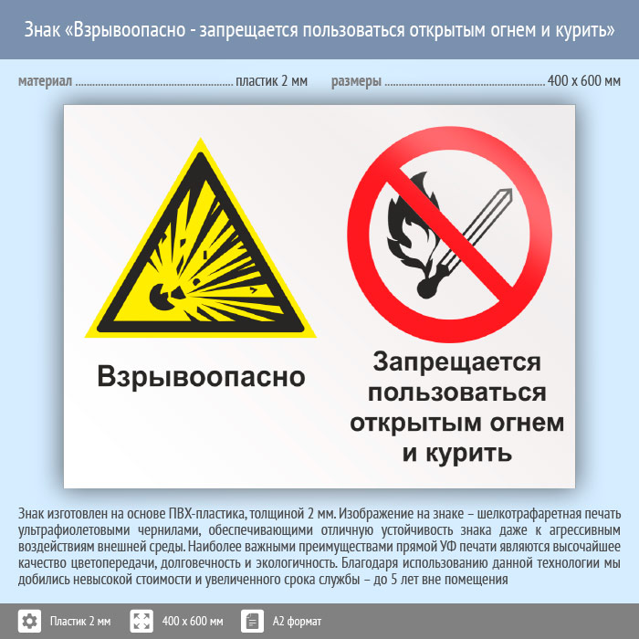 Знак «Взрывоопасно - запрещается пользоваться открытым огнем и курить», КЗ-07 (пластик, 600х400 мм) в Химках купить